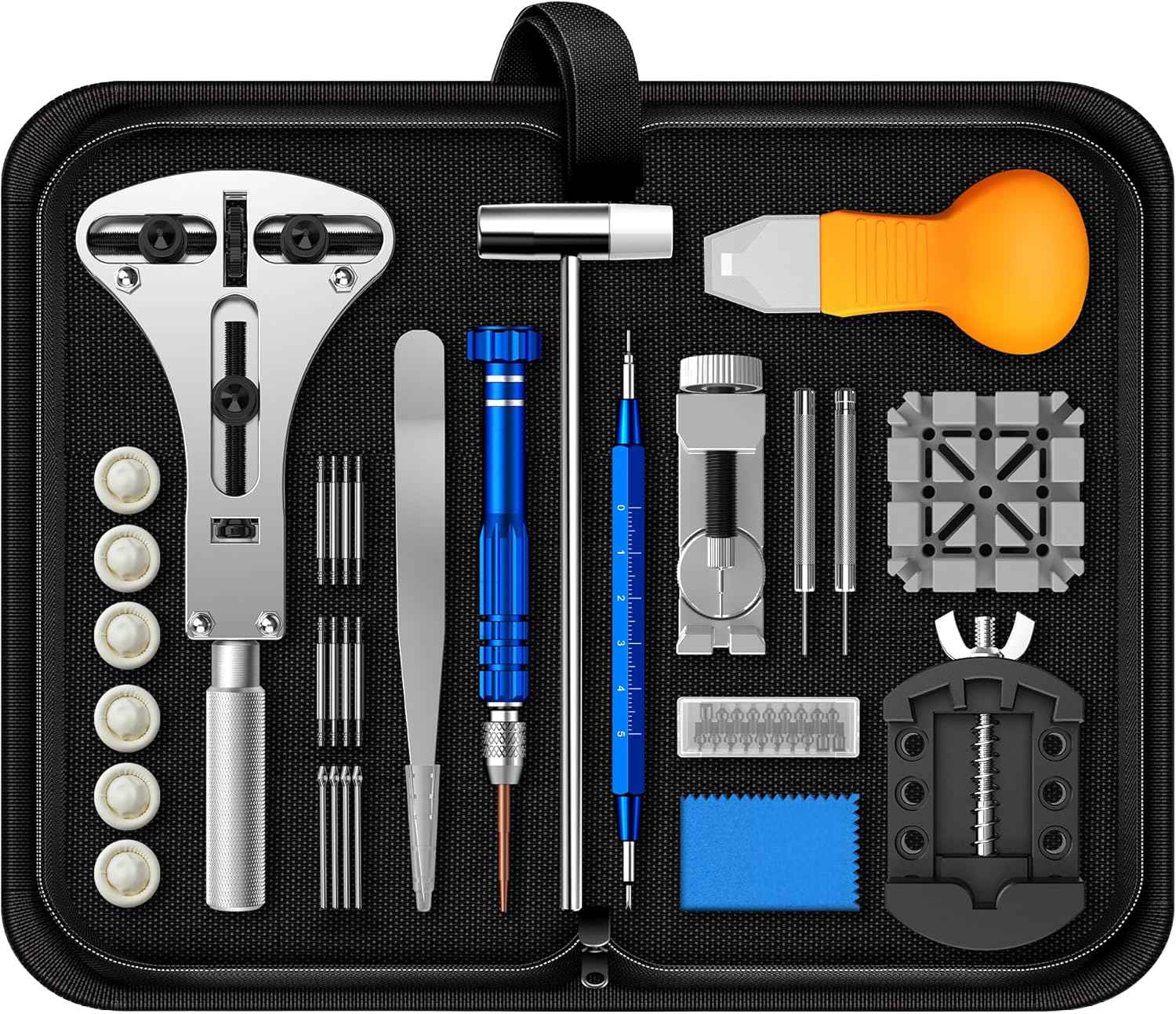 Ce coffret d'outils pour montre, fabriqué en métal et en plastique de haute qualité robuste et durable contient tous les outils nécessaires pour régler sa montre sois-même.